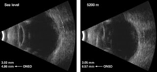 Bao dây thần kinh thị giác giãn 5,3mm ở bệnh nhân tăng áp nội sọ. Đo khoảng cách sau nhãn cầu 3mm và kích thước đo lần sau là đường kính bao dây thần kinh thị giác = 5,3mm (Hình của Michael Blaivas, M.D.)